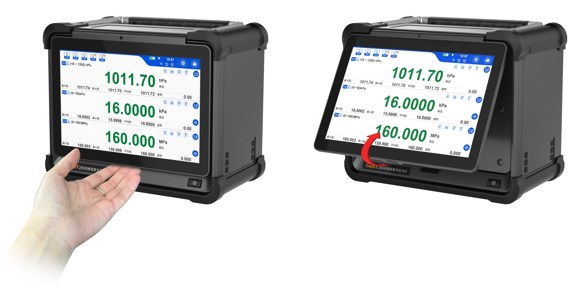 ConST289采用10.1英寸高分辨率液晶触摸屏,主界面可显示所有通道的测量值和仪器状态,采用触摸操作使配置轻松快捷。也可以通过多种通信方式远程操作仪器,以自动获取测量参数。设备的屏幕支持向上翻转30°,十分适合桌面使用。压力计也支持机架安装,组成机柜系统,以扩展更多自动化检校应用。